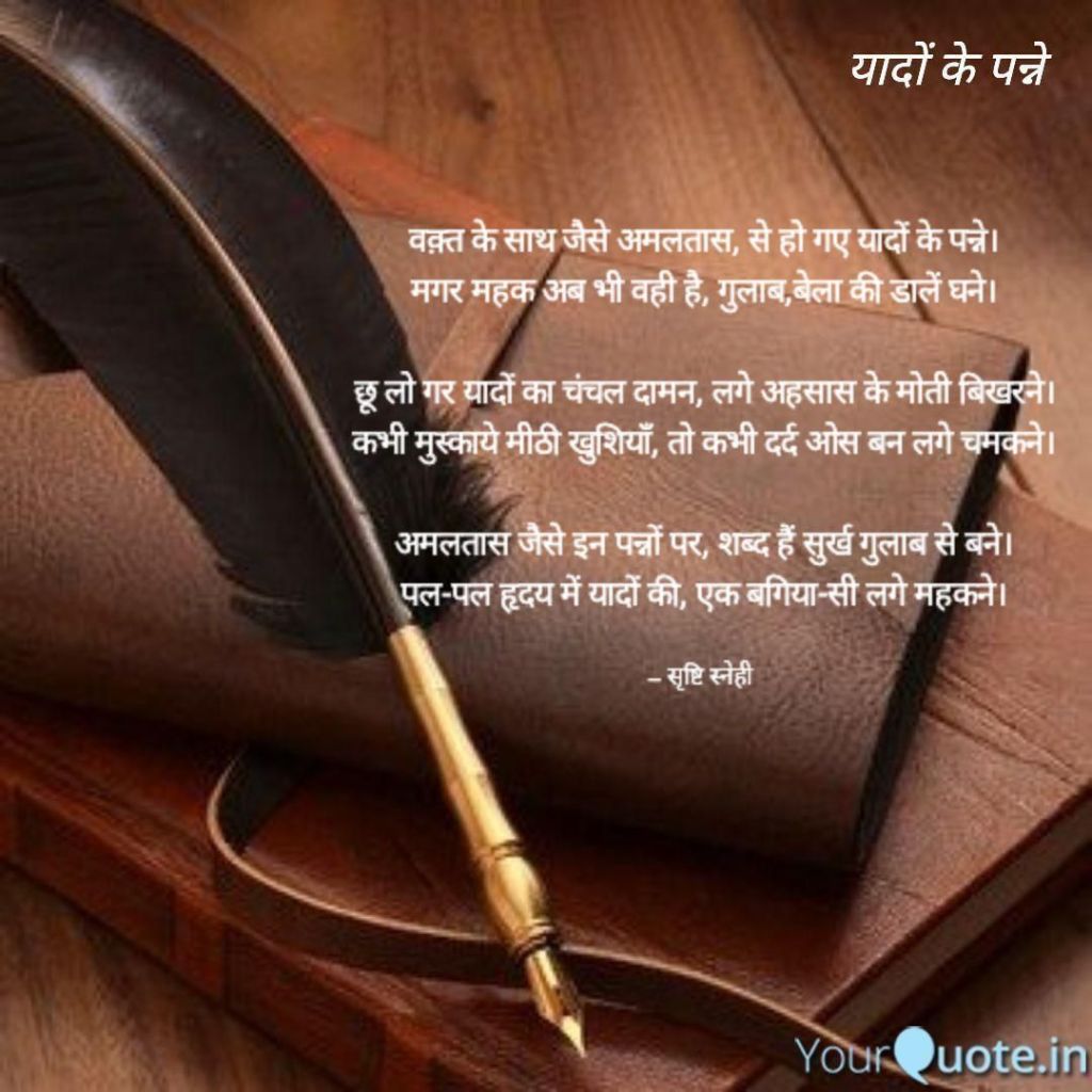 वक़्त के साथ जैसे अमलतास, से हो गए यादों के पन्ने। मगर महक अब भी वही है, गुलाब,बेला की डालें घने। छू लो गर यादों का चंचल दामन, लगे अहसास के मोती बिखरने। कभी मुस्काये मीठी खुशियाँ, तो कभी दर्द ओस बन लगे चमकने। अमलतास जैसे इन पन्नों पर, शब्द हैं सुर्ख गुलाब से बने। पल-पल हृदय में यादों की, एक बगिया-सी लगे महकने।